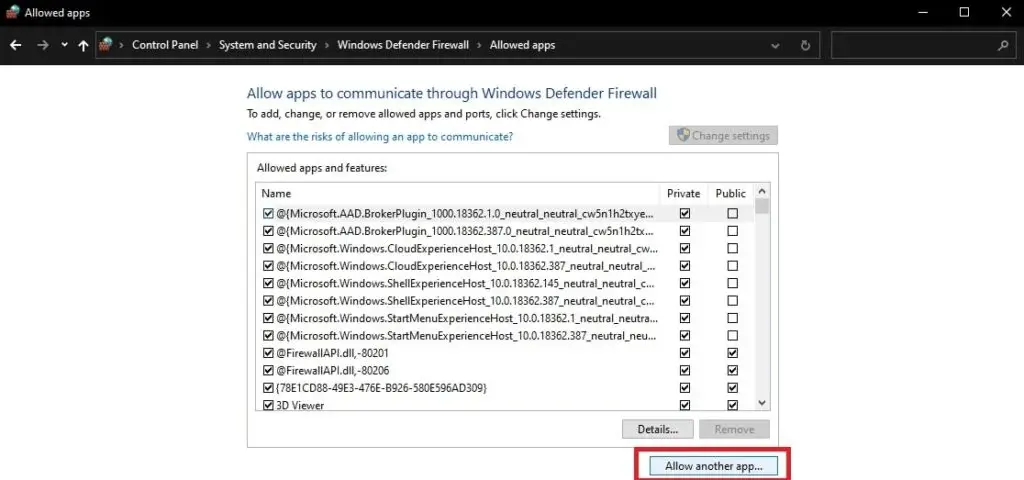 - 그러면 방화벽 제한을 우회할 수 있는 프로그램 목록이 표시됩니다. 이 목록이 회색으로 표시되면 오른쪽 상단의 설정 변경 을 클릭하십시오.