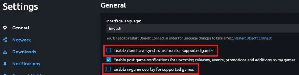 - 일반 섹션에서 지원 되는 게임에 대해 클라우드 저장 동기화 활성화 및 지원되는 게임 에 대해 게임 내 오버레이 활성화 라는 두 옵션을 선택 취소 합니다 .