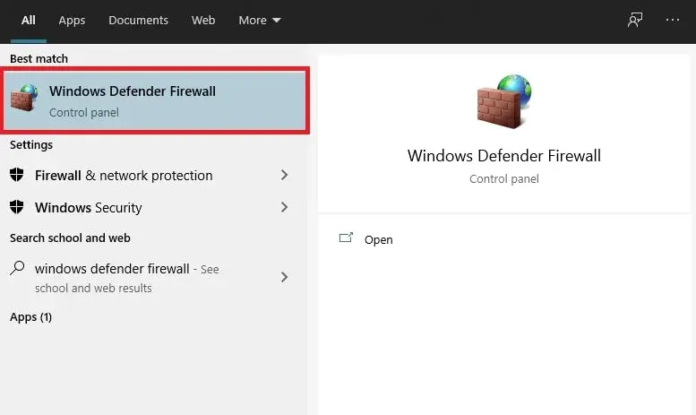 - Windows 시작 메뉴 를 열고 Windows Defender 방화벽 을 검색합니다 .