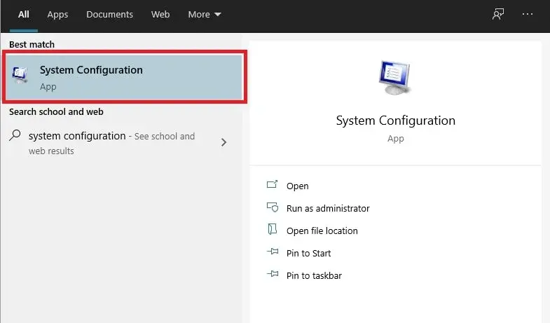 - Windows 시작 메뉴 를 열고 시스템 구성 을 검색합니다 .