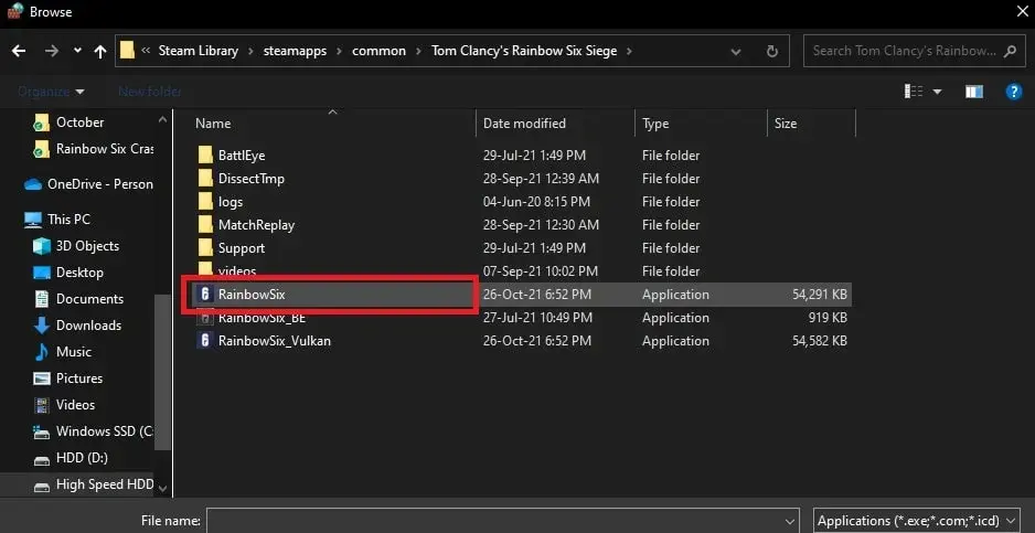 - 여기에서 RainbowSix 라는 파일을 선택합니다 . exe (또는 게임의 Vulkan 버전을 사용하는 경우 RainbowSix_Vulkan.exe ).