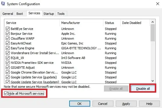 - 그런 다음 서비스 탭 으로 이동하여 모든 Microsoft 서비스 숨기기 를 선택하면 타사 서비스만 남게 됩니다.