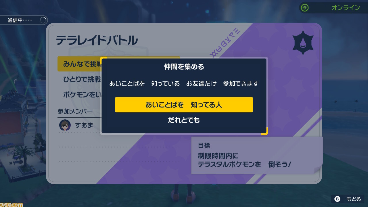 (2)테라레이드 배틀을 주최하는 사람이 “모두 도전”에서 “아이 말을 아는 사람”으로 아이 말을 설정해, 아이 말을 공유.