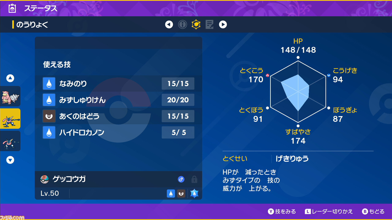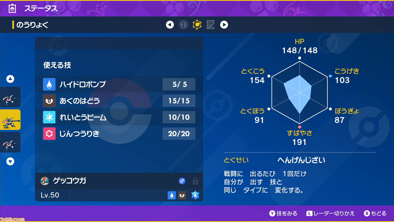 매우 공격 범위가 넓은 겟코우가다운 형태. 기본적으로는 하이드로 펌프나 예쁜 빔으로 싸우면서 특수형이라고 생각한 상대를 물리 기술로 공격한다.