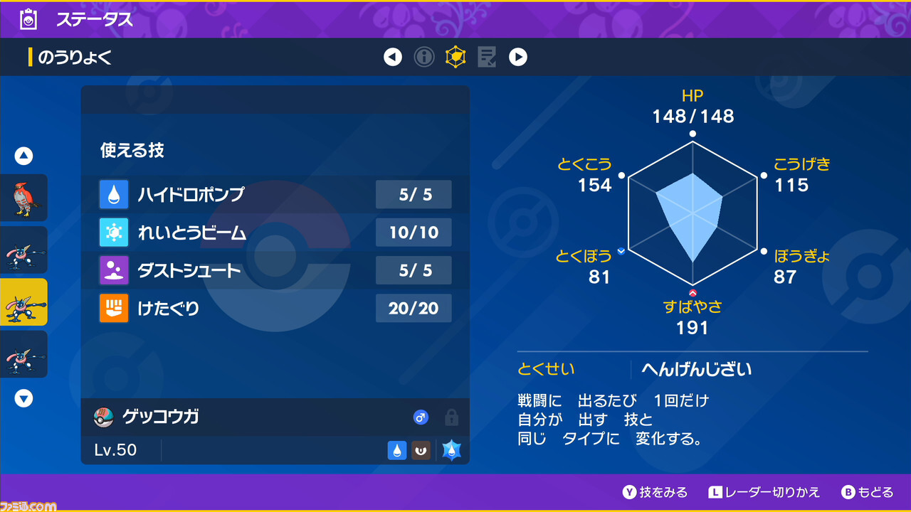 기억할 수 있는 공격기의 타입이 매우 많아, 사용한 기술과 낯선 타입으로 자신을 변화시키는 숨겨진 특성 “힘든 자자”에 의해서 그들을 모두 타입 일치로 사용할 수 있다는 점이 최대의 강점.