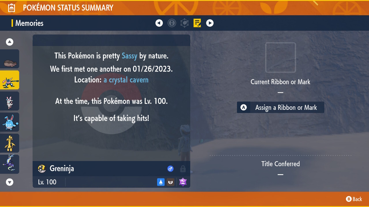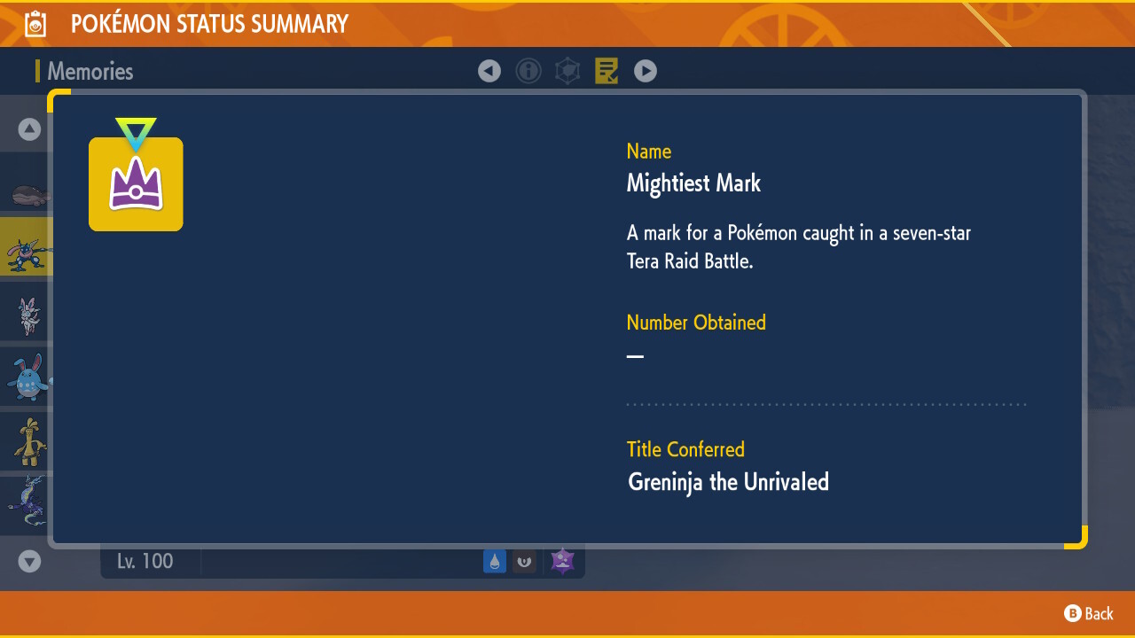 내 것은 "천성적으로 건방진"입니다. 7성 테라 레이드 배틀에서 포켓몬을 잡아 획득한 마크인 '최강 마크' 보상도 제공한다. 가장 강력한 마크의 칭호는 "무적의 그레닌자"입니다.