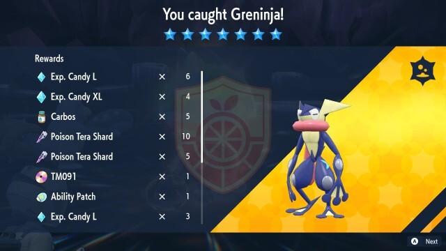 첫 번째 실행에서 7성 Greninja를 쓰러뜨렸을 때 얻은 모든 것이므로 파밍할 경우 무엇을 기대해야 하는지 알 수 있습니다( 세이브 파일당 하나만 잡을 수 있지만 무기한으로 약탈을 계속할 수 있음을 기억하십시오. ):