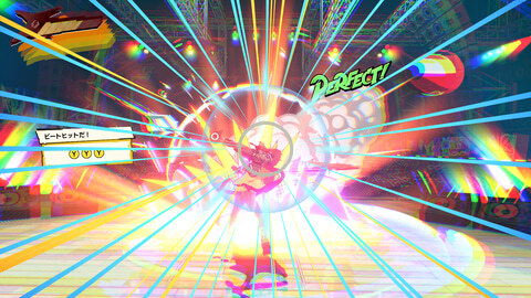 여기서 주목해 두고 싶은 것은, 이 “비트와 동기한다”라고 하는 요소는 게임의 구석구석까지까지 넘어가고 있는 것. 예를 들어 스테이지는 배경은 비트에 맞추어 움직이거나 명멸하고 있고, 다리가 걸리는 등도 특수 효과도 BGM에 맞추어 타타 타타 타탄! 과 소기미 잘 동작하거나 한다. 적의 움직임도 음악에 맞추어 있고, 더 말하면 컷씬의 영상도 음악과 동기하는 형태로 리드미컬하게 만들어지고 있다.