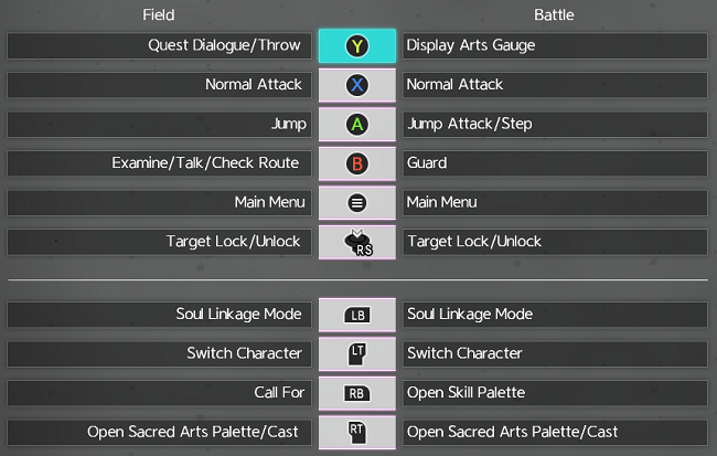 | 파티원 | 제어 파티원 : L2/LT를 눌러 파트너로 전환할 수 있습니다. 아군에게 명령 내리기 : L1/LB를 눌러 파티원에게 명령을 내릴 수 있으며 조이스틱의 왼쪽 또는 오른쪽을 사용하여 파티원을 전환할 수 있습니다. 파티 모드 : 터치패드(지도/메뉴 버튼)를 눌러 파티 모드로 들어갈 수 있습니다. 위 또는 아래를 눌러 속도를 높이거나 낮출 수 있습니다(화면 왼쪽 하단 참조). 소드 스킬과 컴뱃 스킬은 주문하고 싶은 스킬로 커서를 이동하여 파티원이 사용하게 할 수 있습니다. |