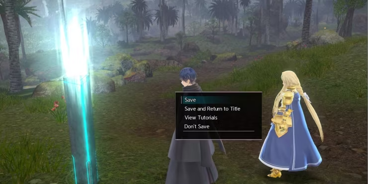| Kirito의 텐트에 액세스하면 그의 책상을 조사하여 캐릭터 생성, 백과사전, 기억, 튜토리얼 보기 및 난이도 변경을 확인하십시오. Save Points에서 튜토리얼에 액세스할 수 있습니다. |