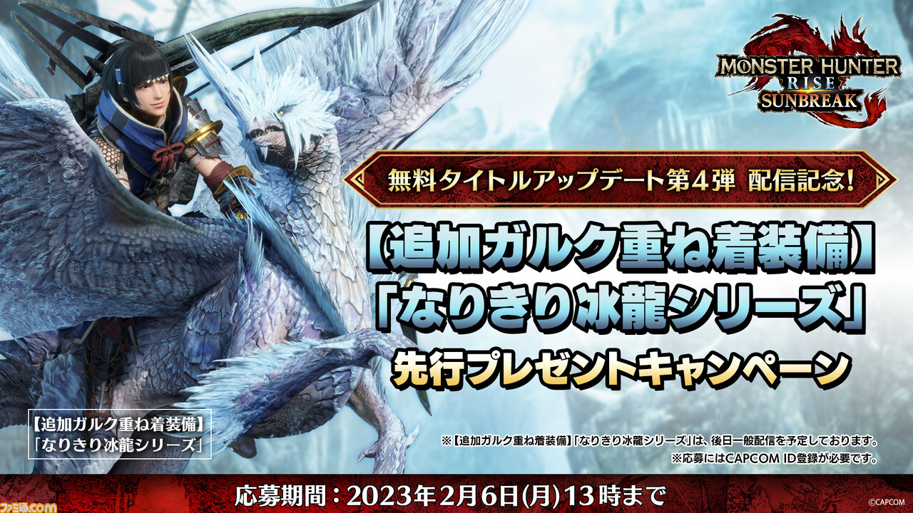 업데이트 내용을 소개한 프로그램 「몬스터 헌터 라이즈:썬 브레이크 스페셜 프로그램 2023.2.2」에서, 선행으로 다운로드 컨텐츠를 입수할 수 있는 선물 캠페인 정보를 공개.