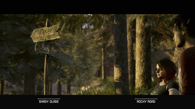 도구를 Max로 가져가면 차량 앞 지면에 상호 작용 프롬프트가 표시됩니다. 짧은 장면을 보려면 이 버튼을 누르세요. Laura는 숲에서 누군가를 발견하고 조사를 원합니다. 여기에서 두 가지 대화를 선택할 수 있습니다.