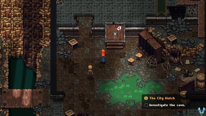 다른 사람들과 대화를 계속하고 계단을 내려갑니다. 여기 왼쪽으로 내려가 더 많은 사람들과 대화를 나누고 가마솥(배경에 있는 모든 기어 위)에 도달하면 여기 금발 NPC에게 말을 걸어 가마솥 수리를 도와주세요. 이것은 당신에게 Sweets 를 줄 것 입니다.