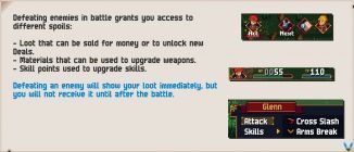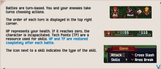 계속 왼쪽으로 가면 한 쌍의 Tarynean Soldiers와 싸우게 됩니다. 여기에서 Kylian이 동시에 두 적을 공격할 수 있는 "Wide Swing" 스킬을 가지고 있음을 알 수 있습니다. 그는 또한 한 파티원을 치료하는 "도움의 손길"을 가지고 있습니다. 굉장히 유용하다. 글렌은 3연속 공격이 가능한 '크로스 슬래시'와 적 1명에게 3턴 동안 방어력과 마법 방어력을 저하시키는 '아머 브레이크'를 가지고 있다. 각 전투 후 TP가 다시 채워지므로 이 전투(및 향후 모든 전투)에서 승리하기 위해 기술을 자유롭게 사용하십시오.