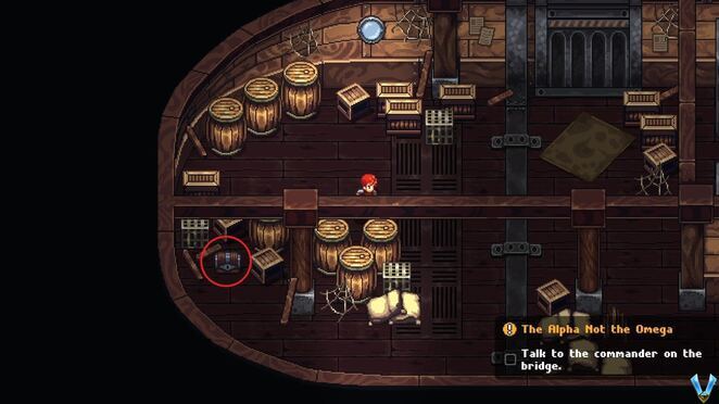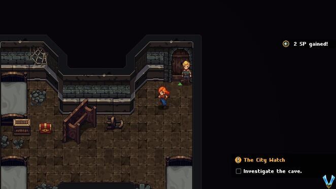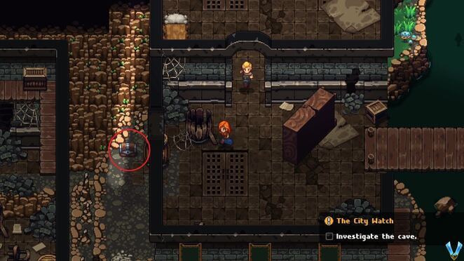 이제 이중문이 있는 방 바깥으로 돌아가기 위해 여기 벽을 아래로 미끄러져 내려오세요. 계속해서 열고 통과하십시오. 터널을 따라가면 Sweets x2 가 있는 상자가 있는 작은 방에 도달합니다 . 그것을 열고 Matthye 라는 사람과 함께 장면을 트리거하기 위해 왼쪽으로 계속 가십시오 . 소동을 일으키려는 사람들의 배후에 있는 사람인 것 같습니다.