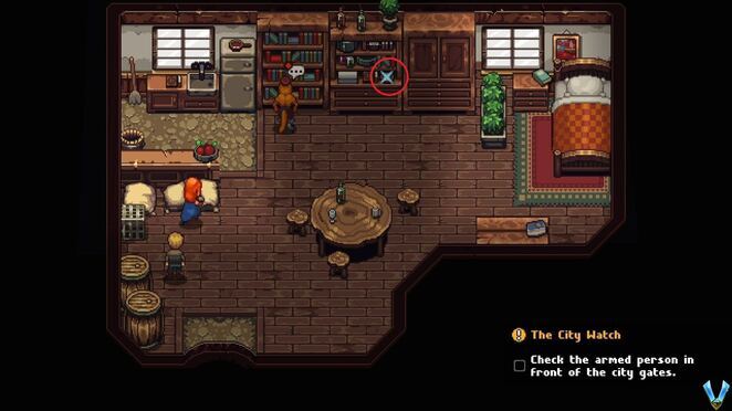 원한다면 다시 밖으로 나가 주변 사람들과 이야기를 나누세요. 이 게임에서 강아지와 대화하고 쓰다듬을 수 있습니다! 예! 지금 왼쪽 위 집에 들어가 바로 오른쪽에 있는 상자를 열어 안약을 받으세요 . 이제 원한다면 여기 있는 사람들에게 말을 걸고 위층으로 올라가서 두 번째와 네 번째 방의 반짝임을 확인하여 Snack 과 Snack 을 찾으세요 .